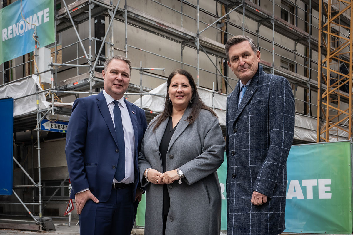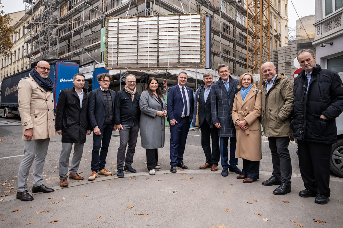 In der Arenberggasse 4 in Wien-Landstraße wird aktuell ein Pilotprojekt zur energetischen Sanierung umgesetzt. Im November werden am Wohnhaus der SOZIALBAU AG vorgefertigte Fassadenmodule mit integrierter Bauteilaktivierung zur Heizung und Kühlung der Fassade angebracht. Aufgrund des hohen Vorfertigungsgrades nehmen die Montagearbeiten nur wenige Tage in Anspruch. Die serielle Sanierung gilt aufgrund der deutlich beschleunigten Umsetzungszeit und nachhaltigen Energiekosteneinsparung als zukunftsweisende Sanierungsmethode und genießt daher hohe Aufmerksamkeit in der Fachwelt und Wohnungswirtschaft. Am Mittwoch, den 12. November, machten sich Vizekanzler und Wohnminister Andreas Babler, Innovationsminister Peter Hanke und Wiens Vizebürgermeisterin und Wohnbaustadträtin Kathrin Gaál ein Bild von dem Sanierungsprojekt.