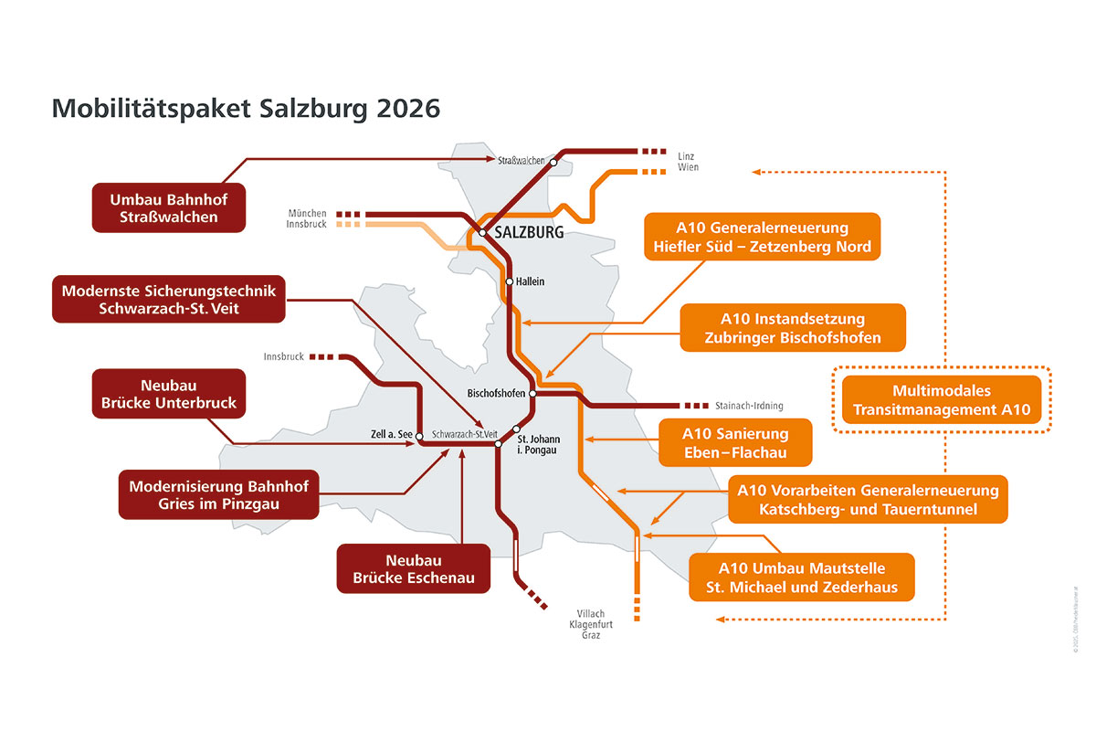 Salzburg liegt im Zentrum Europas und ist ein bedeutender Knotenpunkt im Nord-Süd- und Ost-West-Verkehr. Eine leistungsfähige Infrastruktur ist daher Grundvoraussetzung, um den hohen Anforderungen an Mobilität, Sicherheit und Nachhaltigkeit gerecht zu werden. Das Mobilitätspaket verfolgt einen integrierten Ansatz: Zielgerichtete Investitionen in den öffentlichen Verkehr, zukunftsfitte Straßeninfrastruktur sowie intelligente Verkehrssteuerung sorgen gemeinsam für bessere Mobilität, weniger Staus und eine Entlastung der Anrainergemeinden.